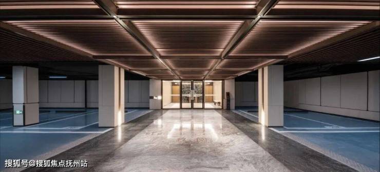 地库车马厅采用 “天地墙一体化”精装设计:顶部是秩序井然的定制藻井格栅,地面铺设天然石材,单元标识采用温润的透光云石,就连门把手也选用了质感厚重的云石,营造更具仪式感的归家体验。