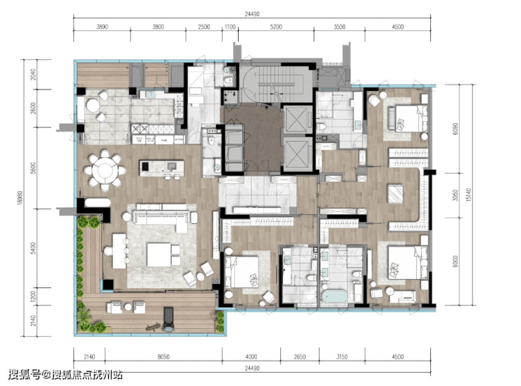 建面约160㎡户型,把“实用”玩出“奢感”,两梯两户,三室配了三卫,居中的一体化餐客厅超懂生活,几乎所有空间都利用到了实处。