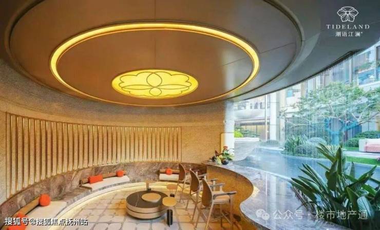 再往里走是归家大堂,水景吊灯非常亮眼,落地玻璃可以直面下沉式庭院
