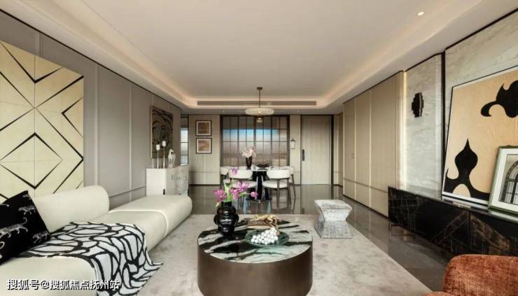 电视背景墙芬迪绿石材的自然肌理、影木饰面的温润触感、沙发背景墙的几何艺术感,不同材质交织出细腻丰富的空间层次,于现代雅居中静诉奢感。