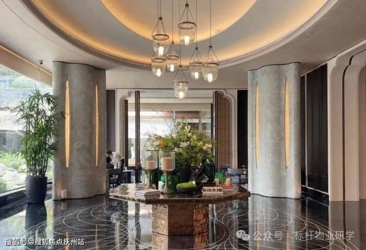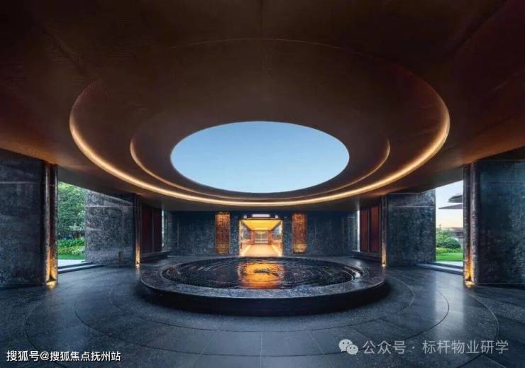 绕过琉璃屏风,映入眼帘的就是升级版的四水归堂。直径8.8米,采用九层叠水,不仅汇八方之财,还九九归一,颇有聚尽天下之财的气势。