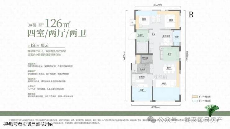 该户型入户S墙设计,客厅和主卧有大半面积是阳台优化而来,厨房和餐厅也是半计产权面积。