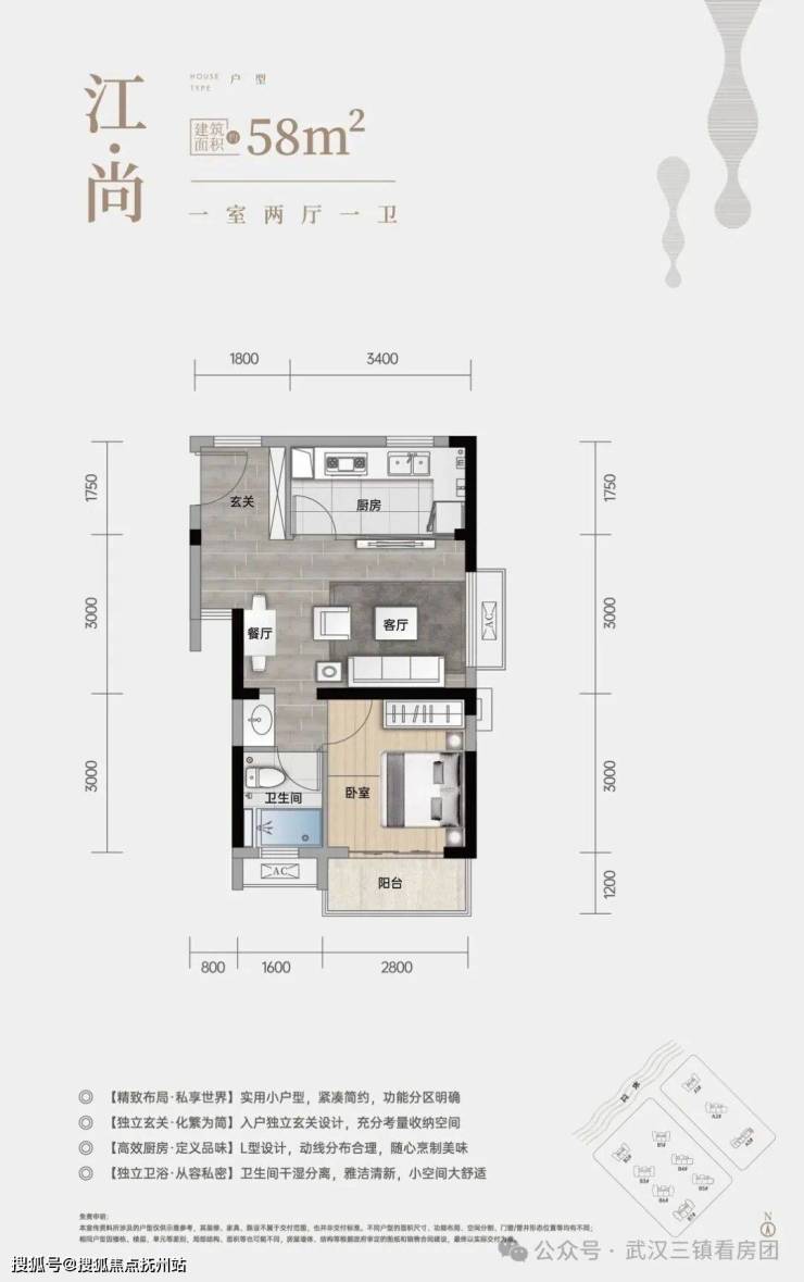 A3#-1号房(一室两厅一卫)实用小户型,紧凑简约,功能分区明确,入户独立玄关设计,充分收纳空间,L型厨房设计,动线分布合理。