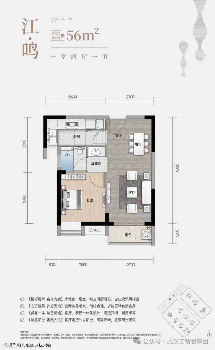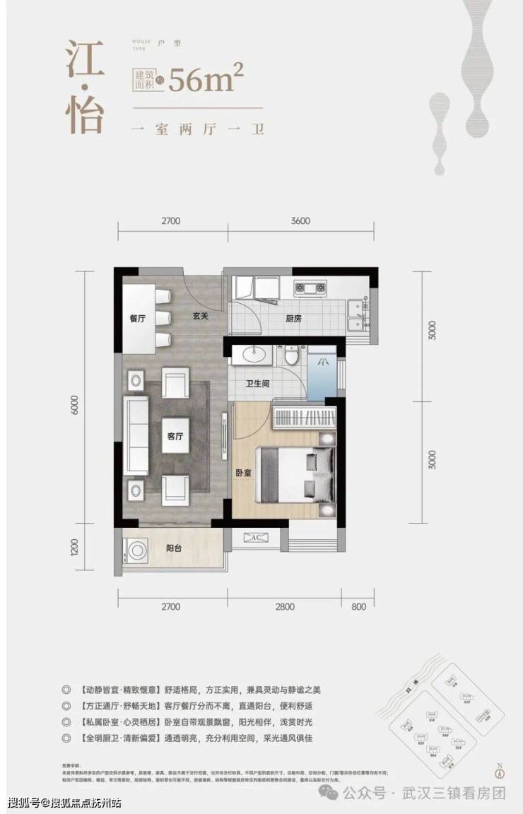 A3#-2号房(一室两厅一卫)独立明厨明卫,自住投资两相宜,舒适格局,方正实用,餐客一体,通透开阔,客厅连接独立阳台,明亮舒畅,感受阳光无限。