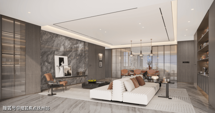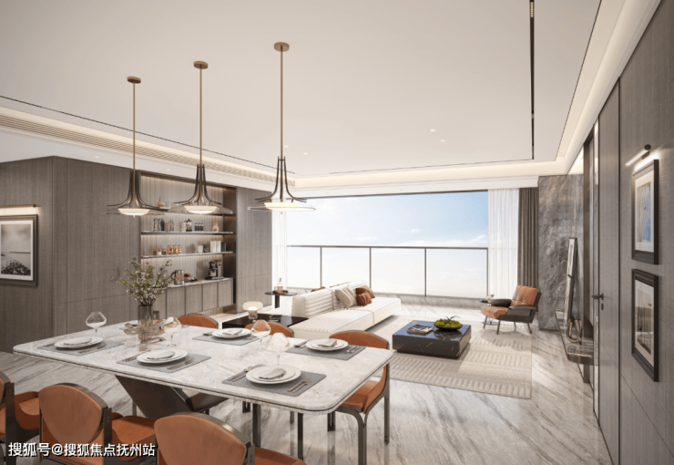 明耀府的外立面,采用底部石材干挂+上部大面积中空玻璃+金属线条的结合方式。不仅现代简约、历久弥新,更以高窗墙比确保室内的采光和视野,质感高级。