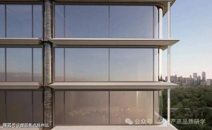 最中间一层,做了古铜色金属挑檐,另外八层则是弧形折面,以金属挑檐为中心,往上下两侧兵分两路,层层递退,变成了两个中轴对称的「镜像坡屋顶」。