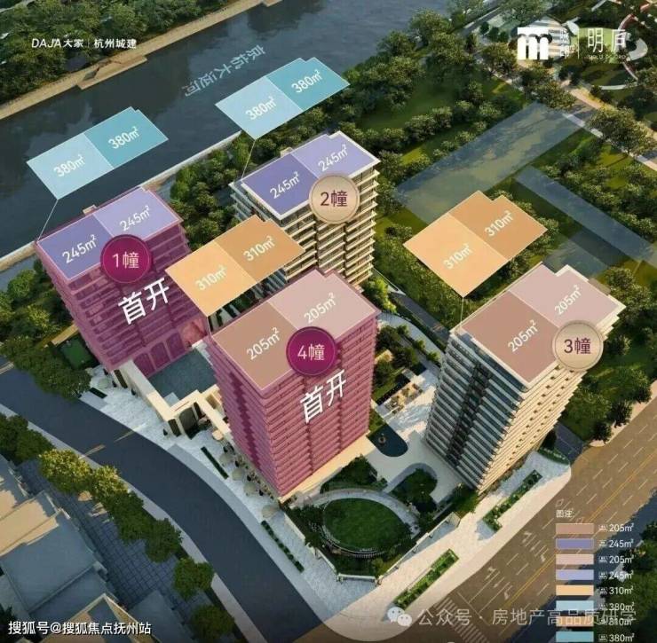 项目规划4幢12-17层小高层,主打205㎡(层高3.15米)、245㎡(层高3.3米)、300-380㎡顶跃(首层3.6米)三大奢阔户型。这是杭州市中心首个全抬板的豪宅,项目通过-1层、M层(地面层)、G层(抬升地面层)做了三级立体抬升,把首层住户最高抬升至约12米的高度。