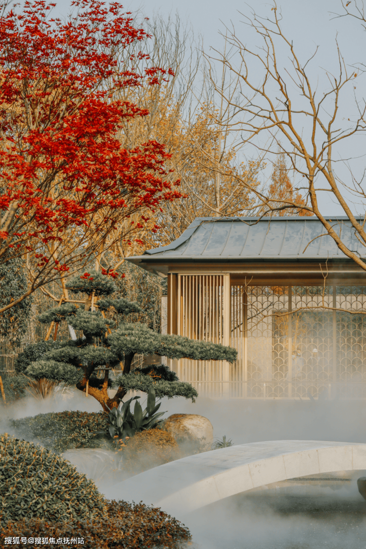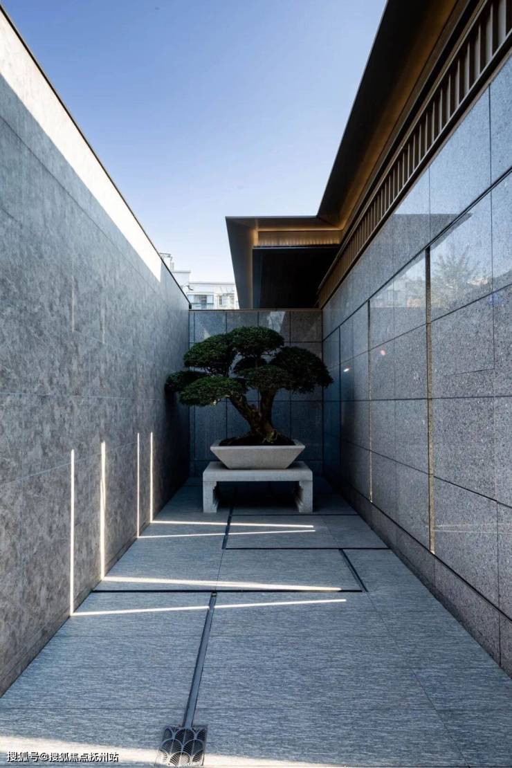 在宅前庭院,通过三个自然层次营造由近及远的山水景象,让空间后退,使层次更深远有韵味。