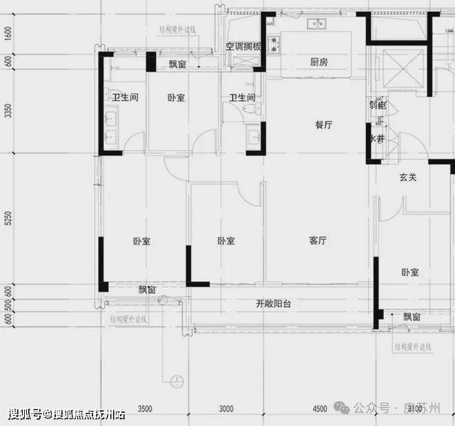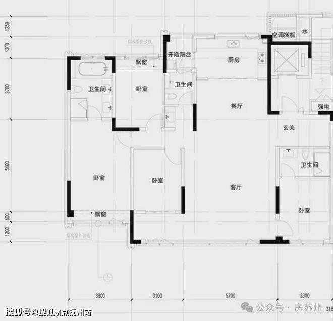 4房2卫,三房朝南,客厅开间4.5米,朝南开敞阳台;房间开间也都在3米以上,其中主卧开间约3.5米,卫生间配置双台盆。