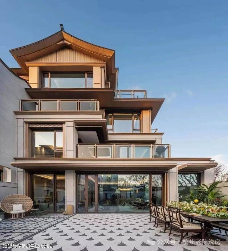 洋房外立面采用石材基座与三面大面积铝板结合,灵动飞檐灵感源于钱江潮涌,勾勒出优雅的韵律感。
