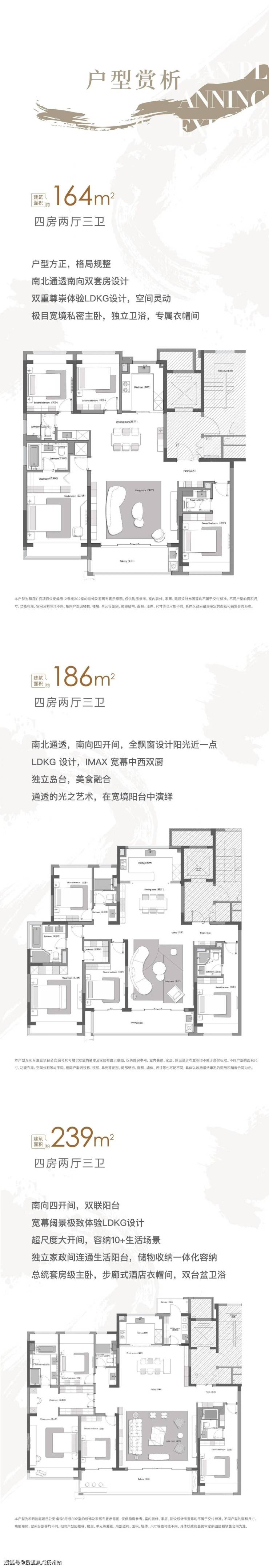 产品类型:主力产品为建面约164㎡、186㎡、239㎡的四房两厅三卫大平层,均为精装交付,装标3000-6000元/㎡。