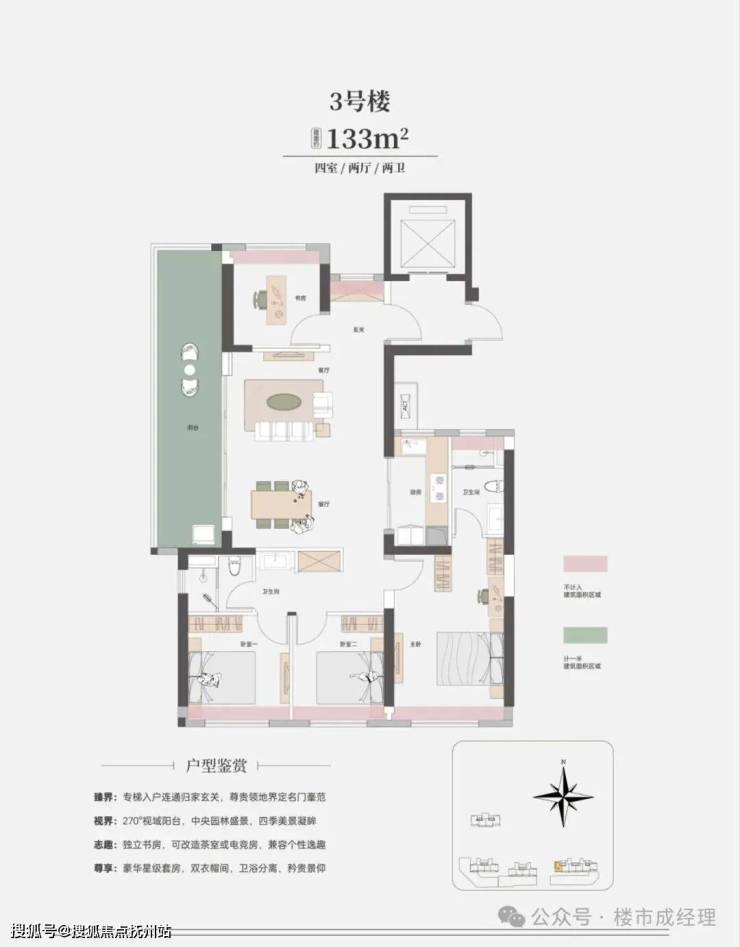 ✅133平(四房边户) 大横厅约9米长大阳台,电梯入户