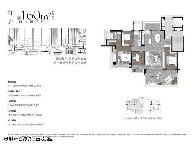 四代宅建面约160㎡户型分为奇数层和偶数层2个户型,均为4房2卫,整体南向面宽约17.2-18.3米,偶数楼层带有约26㎡空中庭院,奇数楼层带有近35㎡转角空中花园,还有南北多阳台设计。