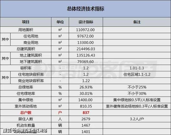 项目总用地面积110972㎡,总建筑面积214496㎡,住宅部分容积率仅1.2,总户数837户,机动车总停车位1467辆(包含110个商业车位)。