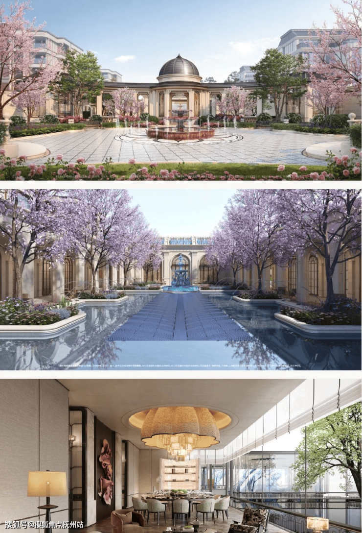 以水为引,起承转合,以海天华堂、华亭烟雨、凤亭问泉,清涟夜月、黄浦秋涛等景观组团,悠然铺陈东方院落式归家礼序。