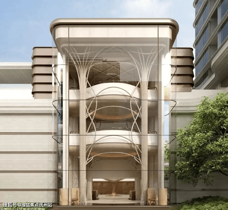 因项目整体抬高,从下沉庭院到架空层“空中花园”的落差极大,形成独特的峡谷地貌,杭序府的设计团队汲取九溪烟树为造园灵感,打造一个立体多维的城市溪谷交互园林;因项目毗邻江岸,杭序府的外立面以“站立的江潮”为灵感,