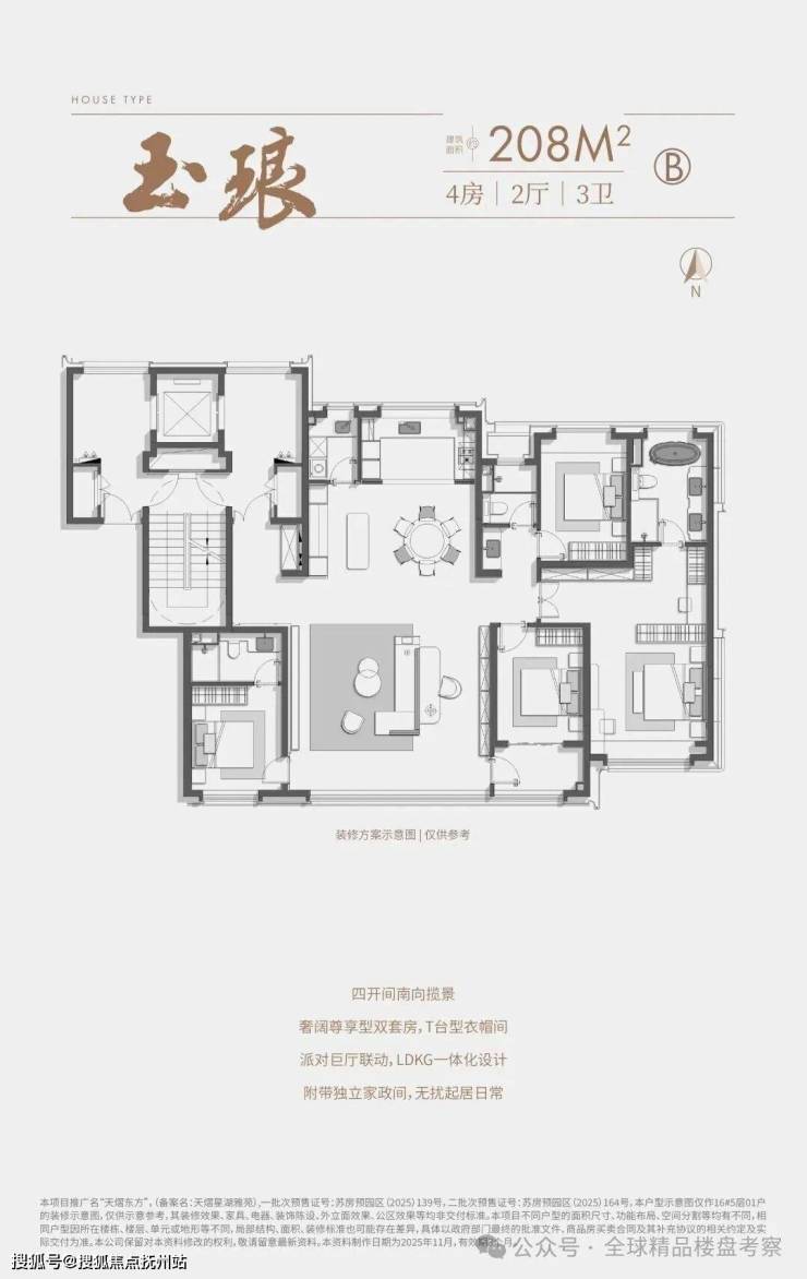 主力户型为建筑面积约208㎡四房,采用类一梯一户设计,强调居住私密性。该户型实现约16.9米南向面宽、近80㎡的LDKG一体化厅区,并设置独立家政间与全龄段套房,兼顾社交接待与家庭起居需求。