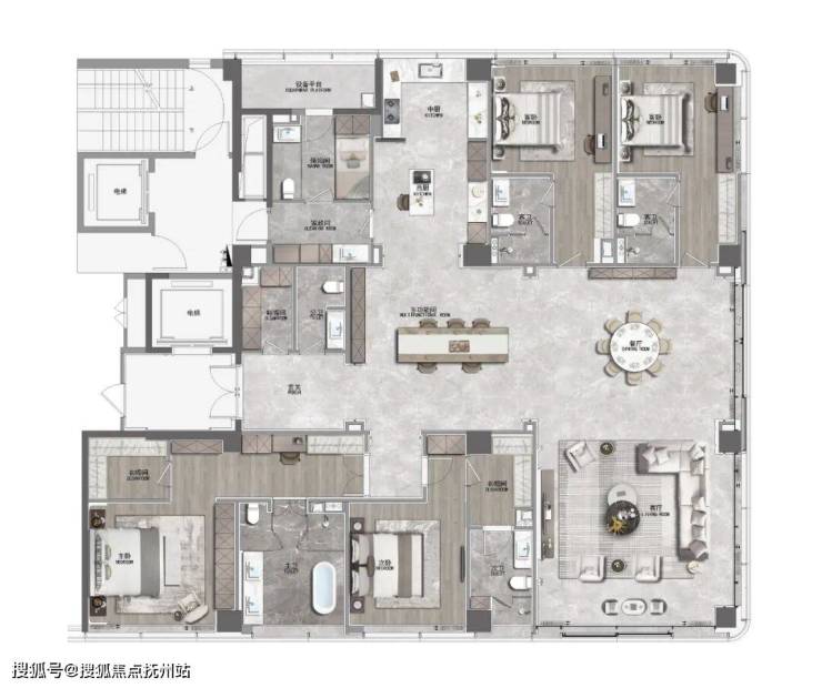 410㎡“湾潮”户型:WSD世尊主笔,4套房+保姆间设计,法式艺术走廊与双衣帽间主卧]。