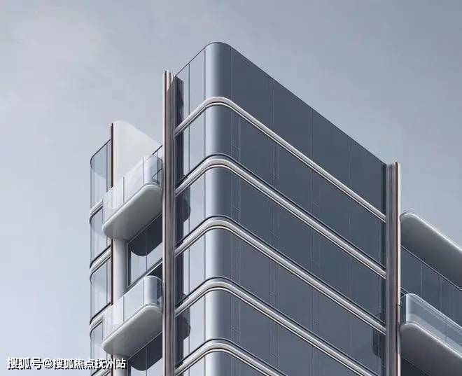 高层建筑立面效果图如下,材质以大面积玻璃幕墙为主,加以白色、香槟金色铝板线条修饰。叠加错层露台、圆弧形转角等设计,很是惊艳。