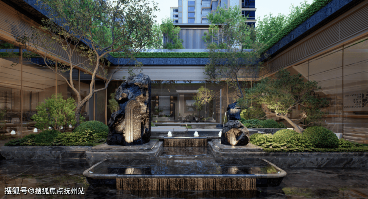 约400㎡下沉水院,营造出静谧深邃的视觉感受,水流潺潺,树影婆娑,城市的喧嚣仿佛被隔绝在外。约120㎡禅意茶舍,则为业主提供了一处可以静坐、品茗、会友的精神角落。