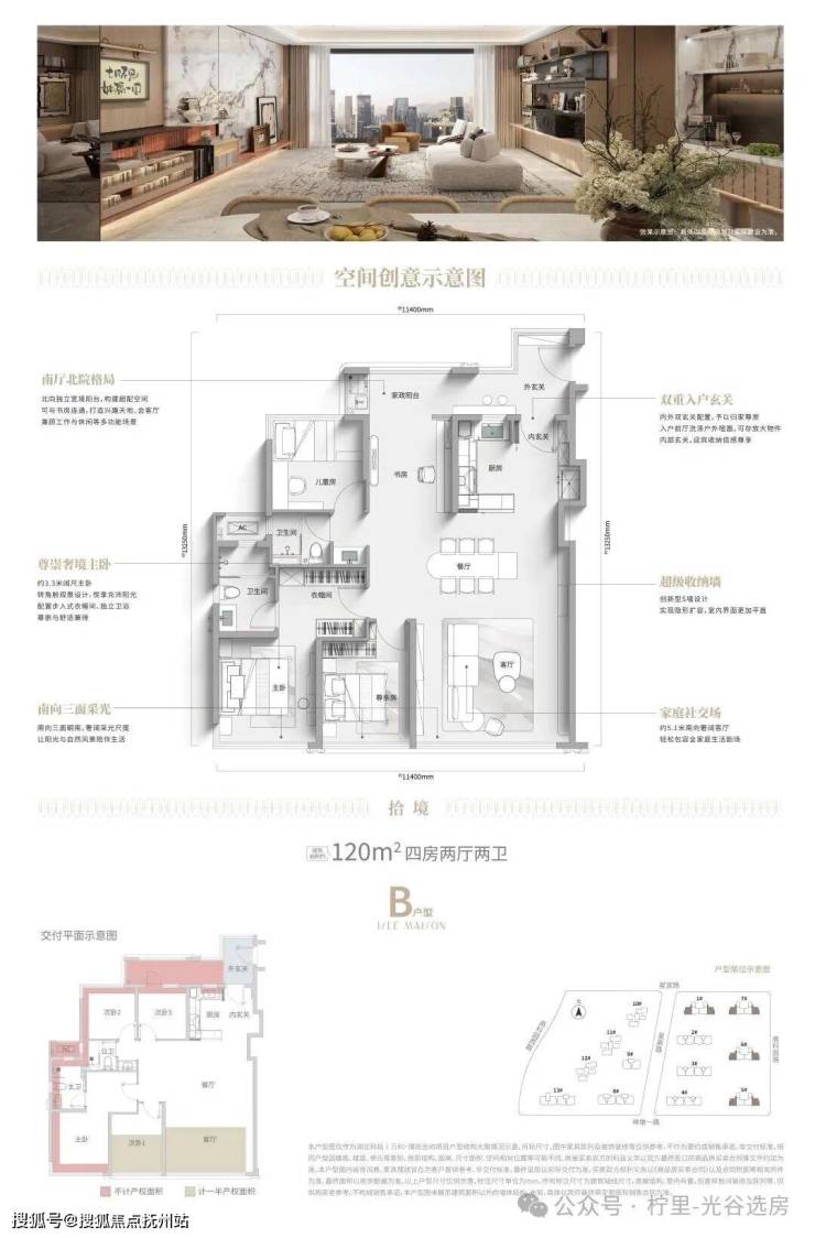 建面约120㎡:进阶四房首选!尺度更舒适,空间更通透,南厅北院的设计让生活场景多了更多的想象空间,这是可以满足三口、甚至三代之家的全生命周期需求的户型;