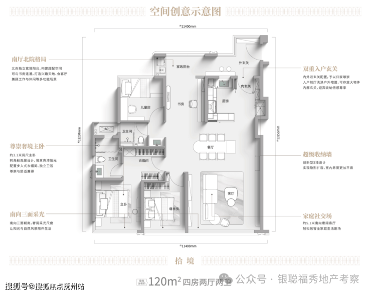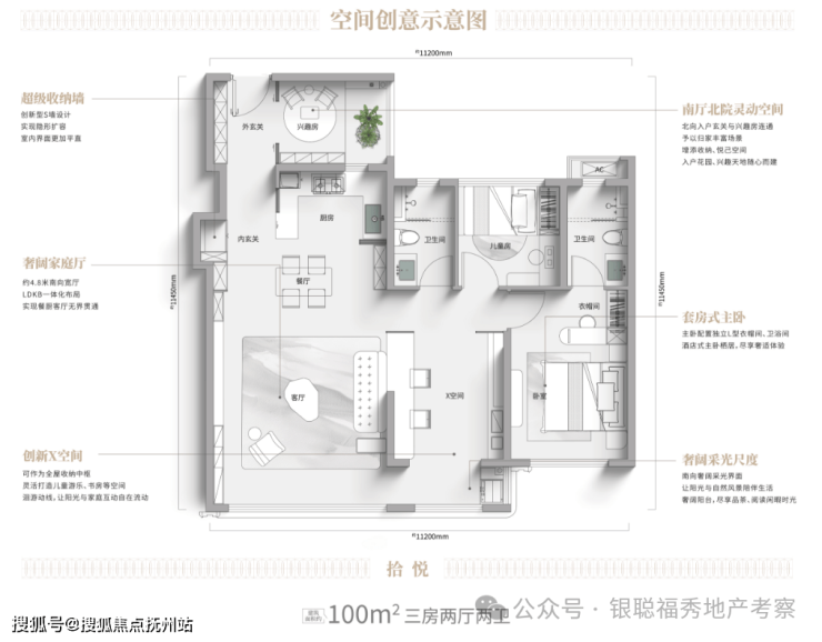 它有“地”:客厅朝南,“南北双境”,诗意烟火,各就其位。
