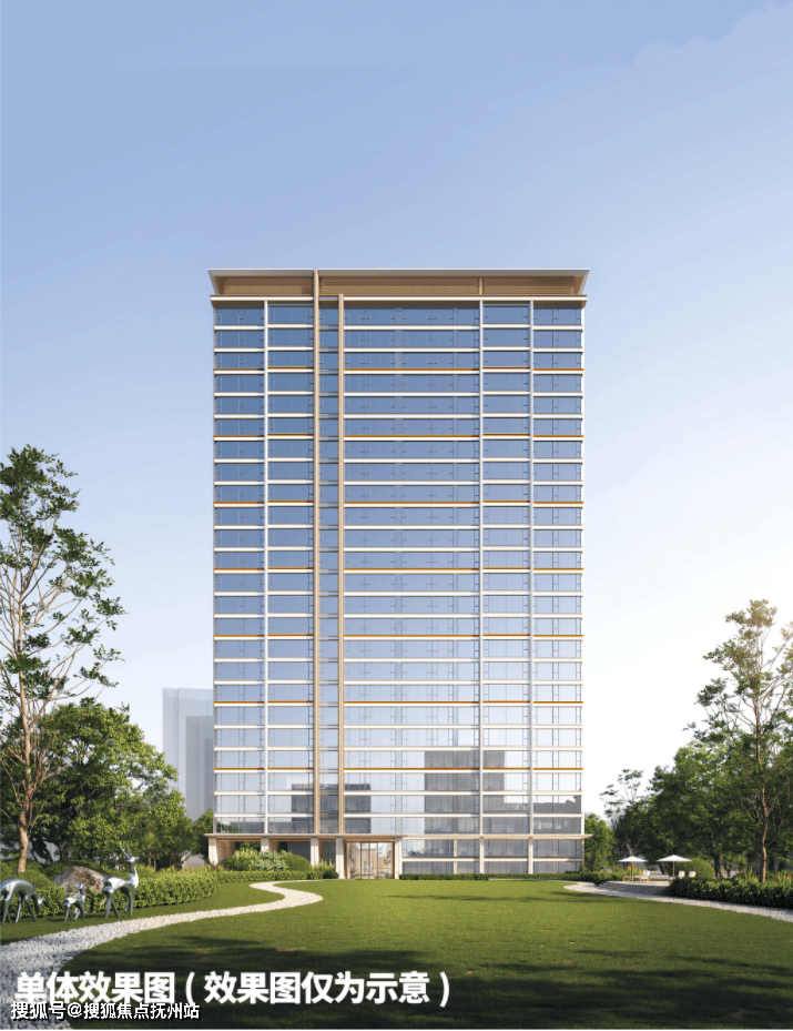 项目的外立面,建筑风格整体上看和市面上大多数四代住宅差不多,正面都是大面积玻璃、香槟金的格栅线条切割、顶部的挑檐冠冕设计。