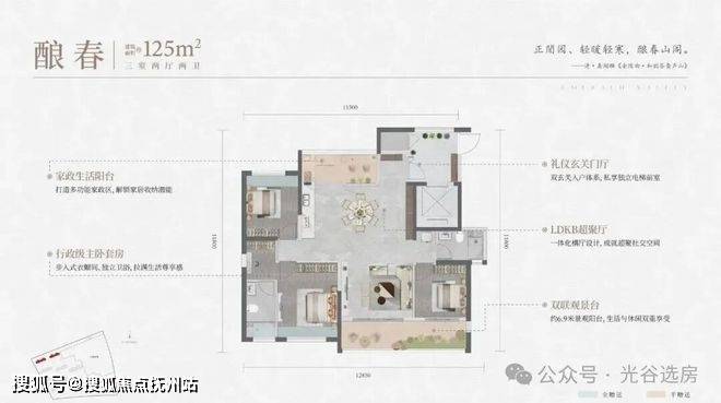 建面约125㎡的三房两厅两卫,是全封窗的准四代产品。