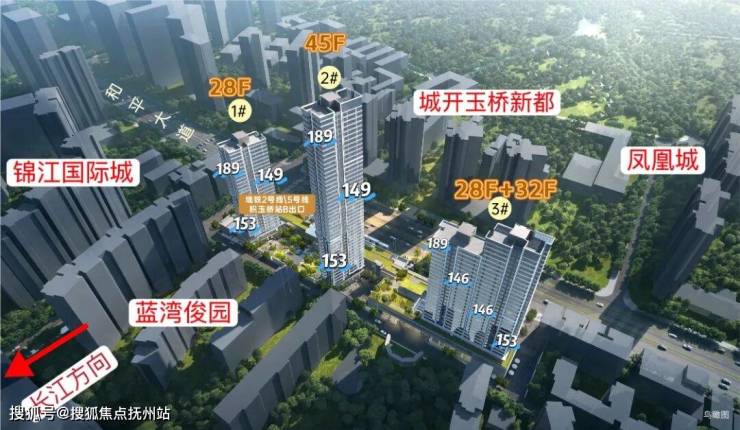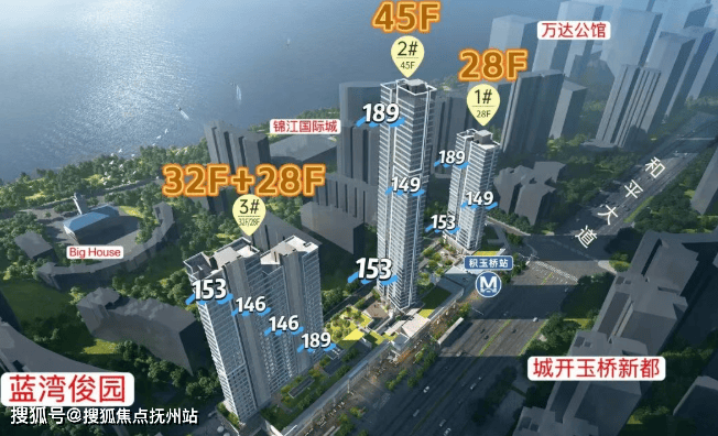 项目一共3栋楼,1号楼28F,2号楼45F,3号楼两个单元,一个28F,一个32F。项目户型为146/153/188㎡。其中,1号楼和2号楼,2-15F都是153㎡户型;16F及以上,西边户是188㎡户型,东边户是153㎡户型。