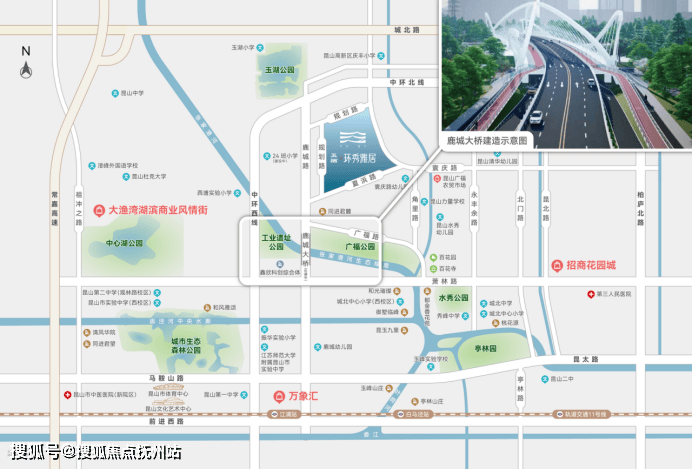 项目踞昆山高新区核芯,鹿城路北延直通中环高架。项目与万象汇、招商花园城、森林公园、体育中心及周边邻里商业,构筑 10 分钟繁华生活圈。