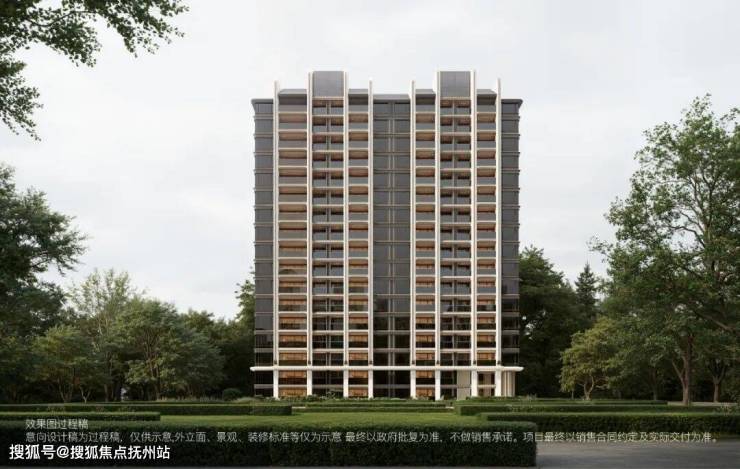 小高层的塔冠,项目通过向上生长的体块、线条和简单的凹凸形成光影效果,给建筑注入摩登和时尚气质。标准段则是通过双柱以及大面积玻璃,展现出线条秩序美感和通透质感。基座采用石材以及金属型材、古铜色水平向构件,营造出厚重价值感,和主入口的门庭厚重感一脉相承。