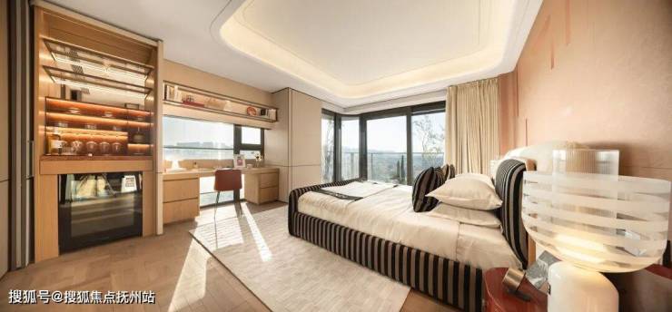 双露台带来的不仅是功能上的丰富,更重构了居者与湖景的关系。这一理念同样延伸至该户型的其他空间,比如——主卧套房通过转角玻璃幕墙设计实现三面采光,约17.8米南向面宽构成超奢观景平台。