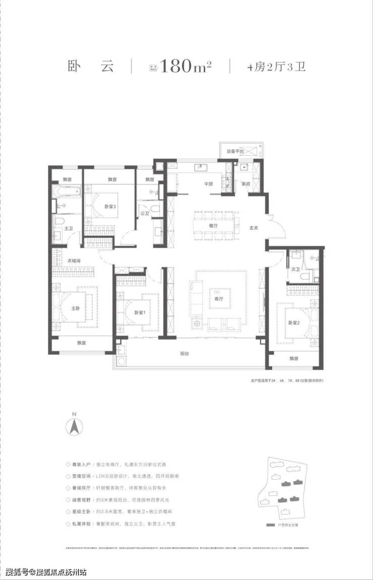 四房两厅三卫,作为洋房的得房率很高,步入样板间就能感受到。约6.95m的横厅的开阔性,南向双套房,主卧开间约3.7米,次卧约3.4米,客卫落于两个北次卧的中间,处处彰显细节。