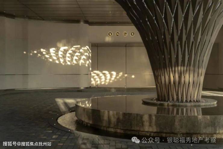 约250米长的超长景观墙界面,以及42m宽、4.8m高的仪式感门厅,入口采用酒店式环岛落客,中心设置寓意「天下四聚」的艺术装置,不仅展现出归家的蕴贵门面和仪式感,还与苏扇工艺打造的黄金池底基座互相辉映。