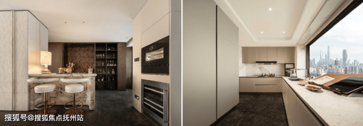 厨房内竹纹夹丝玻璃门、威乃达坡璃烤漆橱柜、与卡拉拉金大岩板台面相融,同时嘉格纳十件套满足每一种味蕾的偏好,厨房内,灶台/油烟机/洗机/冰箱(独立分体设计)五件套;向外,嘉格纳咖啡机/暖碟机/酒柜/烤箱/蒸箱等西厨五件套配置,构筑中西共融的烹饪场域。