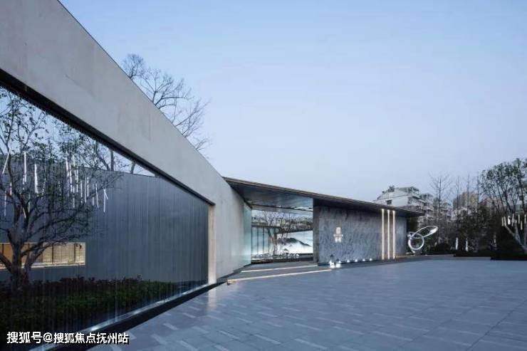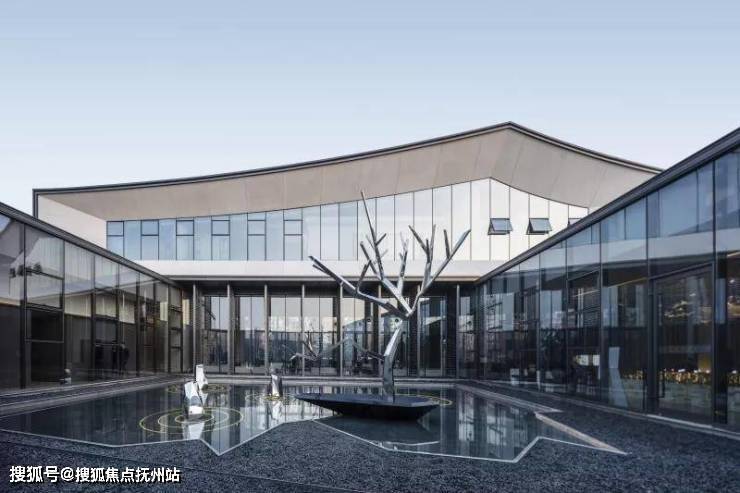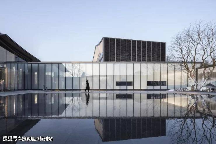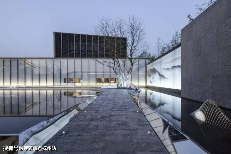 穿过大型玻璃构筑,走进前场。门楼前开阔的广场,昭示了元垄·华著“现代化、城市化”高端楼盘的定位。穿过西周直江上的景桥,即可看见景观水帘,水流淅淅沥沥地流淌,灵动悦耳,与简约的门楼相互映衬。踏上台阶,超大水面映入眼帘,水中倒映着简约现代、充满绍兴特色的销售中心建筑。