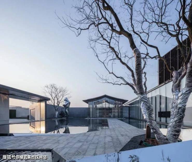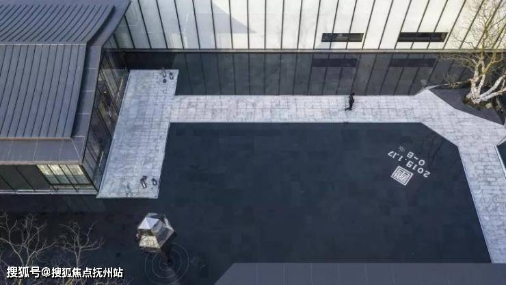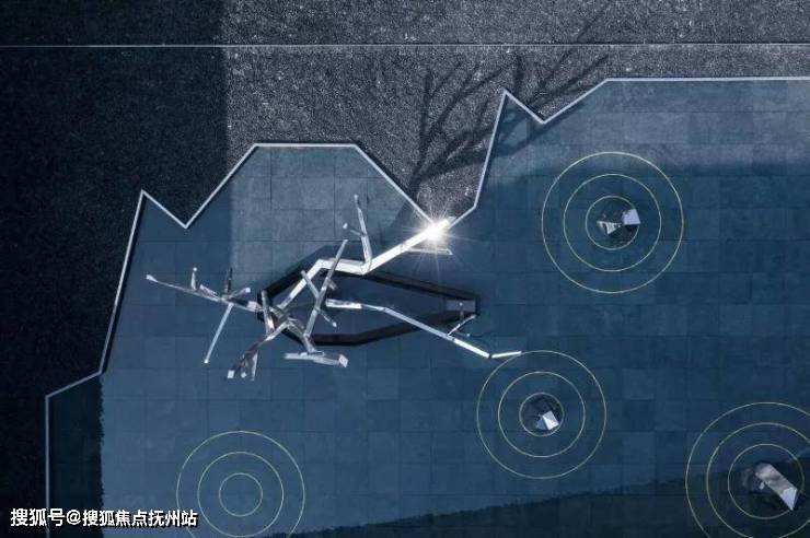 镜面水景倒映着建筑的倩影,水面与建筑融为一体。人们踱步经过,从水景侧边的镜面不锈钢中,不断看见自己的身影,趣味十足。黑色的池底,仿若一方墨池,呼应绍兴后马八景之一的“趣园墨池”。景观雕塑仿照绍兴柯岩云骨之形,静于水面,正气凛然。