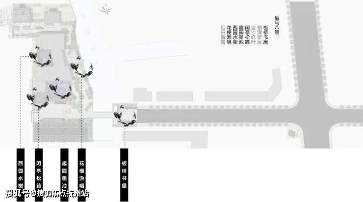景观设计结合当地文化元素与现代手法,遵循经典,演绎时尚。在诠释现代美学的基础上,注入文化元素。设计灵感源于绍兴后马八景,取其中五景作为示范区景观空间:入口合院(板桥书屋)、前场空间(趣园墨池)、看庭空间(闲亭松籁)、水庭空间(西园水榭)、后场空间(花梗渔唱)。