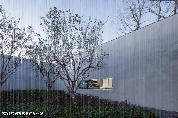 景观门楼既是入口,也是前场的景观连廊。步入连廊,一面内置水乡特色山水绢画的U玻景墙展现在人们面前,水墨韵味满盈。
