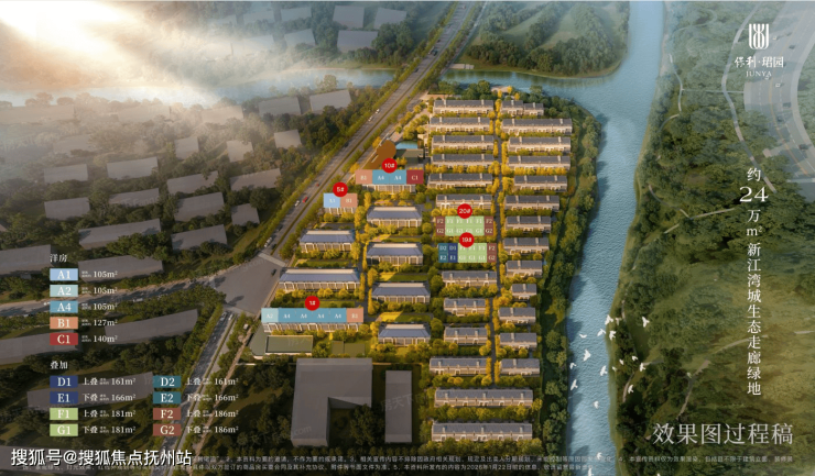 (2)沿河布局:一线临河道+绿化的楼栋总共17幢。采取了东高西低的策略,其中东侧和北侧7字型排布3F联排别墅,其后依次布局4F叠墅与6F洋房,使前排建筑不遮挡后排视野,超过半数楼栋可享受水系与公园景致。