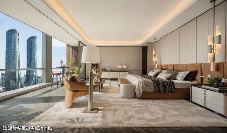 主卧双开门进来,做了洄游动线,足足有约95㎡,衣帽间男女分区。主卧mini吧,睡前喝杯红酒,倚靠在阳台上看迷人夜景。