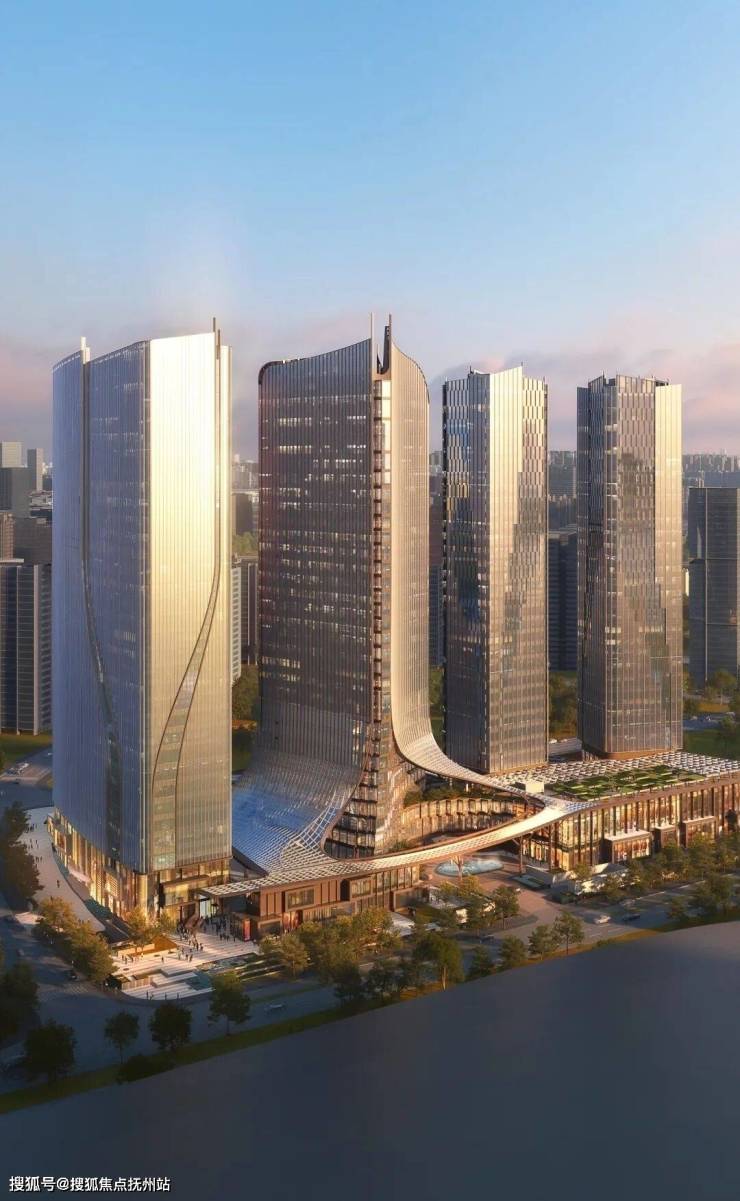 整个建筑群的布局沿着奔竞大道展开,由四栋塔楼和附属的酒店配套裙房共同组成。这个 26 万平方米的综合体项目,由七位行业大师联袂打造,其设计的核心理念是将国际化大师的智慧结晶、艺术性生活表达和杭州本土文化的融合,创新出一个独一无二的“城市会客厅”。