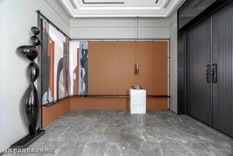 玄关米白色的背景基调给予空间雅致的感官体验,波纹图案与人物的剪影结合,以抽象的手法,从线条与块面的结构中抽离出现代都市的时尚调性。艺术雕塑去存繁复多余的细节,以柔和的弧度勾勒入户的整体基调。