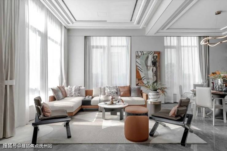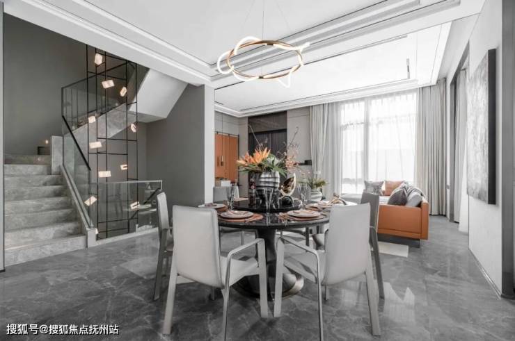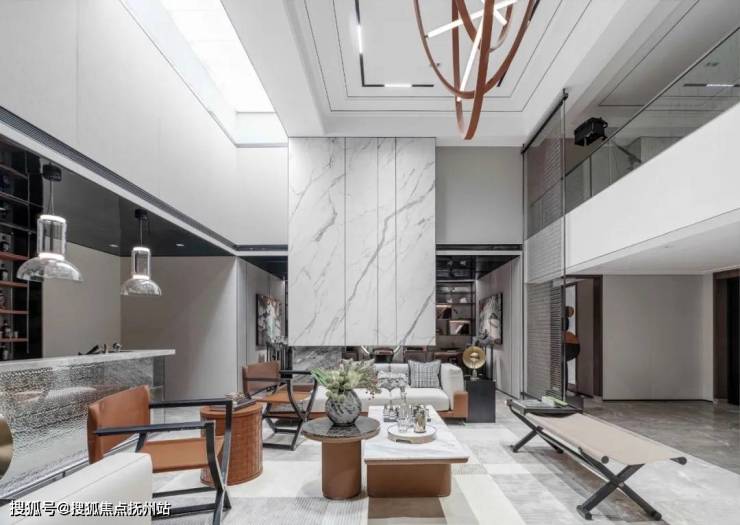 主体简约的基调向下延伸,仅凭借艺术装饰及材料的纹理丰富整体的层次感,层高的优势给予空间更多功能性的运用。