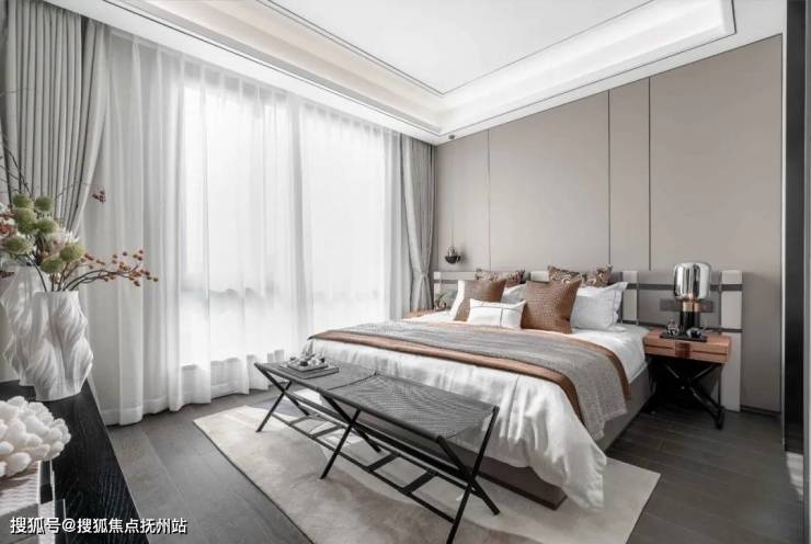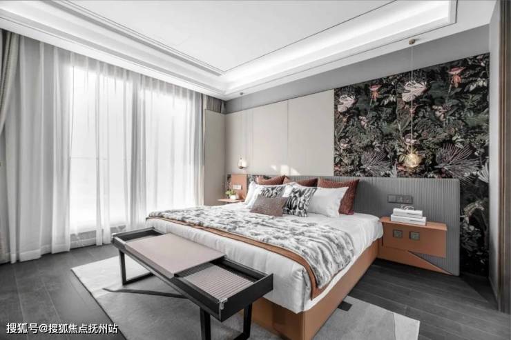 主卧空间将大自然的绿意映入室内,提取江南园林中的鲜活生机结合充满艺术感的表现形式,花鸟动物的形态动势,似静似动,宛如将园林中的清新带入生活。软装陈设中绿植、雕塑与画作和外部空间的自然景色相呼应,在城市的一隅刻画品质生活。