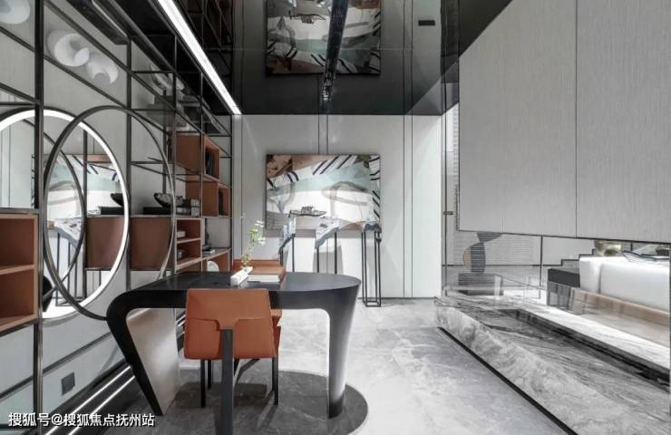 黑色金属、玻璃隔断、与大理石台阶拼接环绕,金属的结构规则地向室内蔓延,形成简约方正的动线。艺术装置轻巧落下,与规则的室内规划形成鲜明的对比,驱散了冷硬、单调的整体氛围,为空间增添一丝活力与自然。