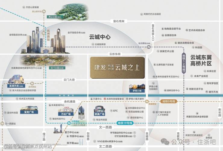 临近云门、未来杭州第一高楼约399米金钥匙(在建)、约320米金手指(在建)、浙江人才大厦、杭州资本云城科创中心(在建)、超重力实验室(在建)等云城核心地标。