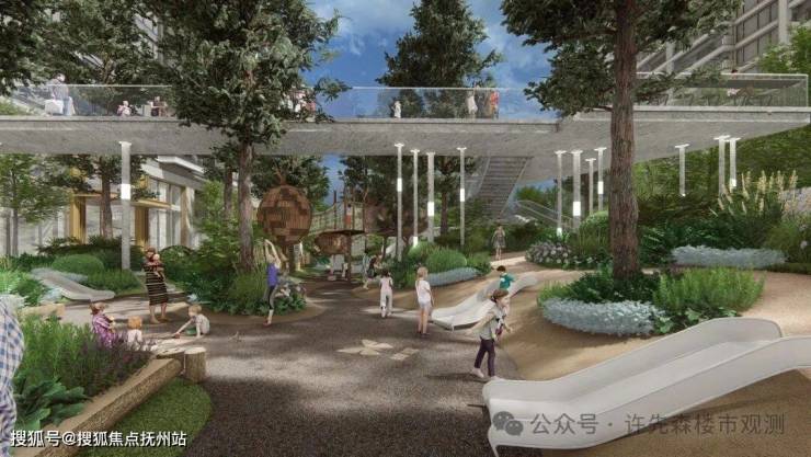 B2地块园林景观由翊象设计操刀,以“谧居、云梦泽”为主题,对标纽约MOMA广场,以当代艺术馆为基底,定制艺术雕塑,汲取浑然天成的自然禀赋,打造艺术、自然、静谧的园区景观。B2落地长江中心项目最大的儿童玩乐空间,落地达尔文营地,为孩子提供自然认知、自然探索的环境。