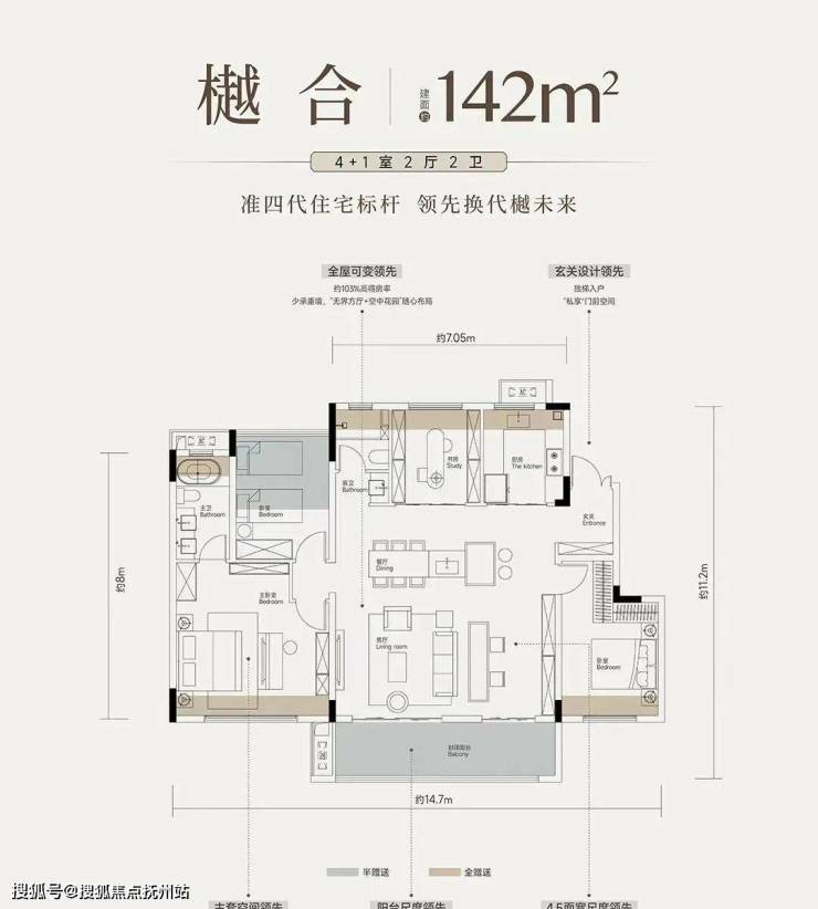 这是一个建面约142平的洋房户型,6个飘窗全赠送,南北两个阳台半赠送,正因为如此,能达到103%的得房率。