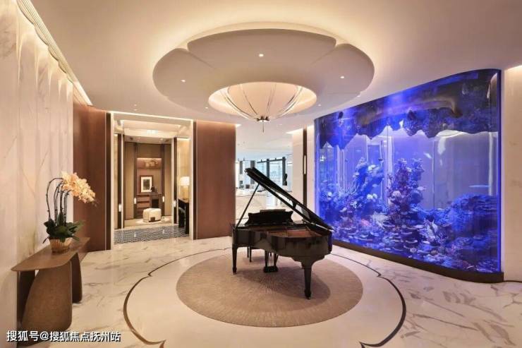 从盗梦空间来到少年派奇幻漂流中的发光海洋,弹着钢琴,看热带鱼群在珊瑚礁中穿行游弋,营造的是另一种梦境。整面深海鱼缸造价100万,因为70吨实在太重,限定8户,先到先得。这是双开装甲门进来的过厅,中央一台钢琴,左边是深海鱼缸,右边是鱼肚白拼接出的极富立体感的大鹏展翅,寓意着海纳百川、鹏程万里。